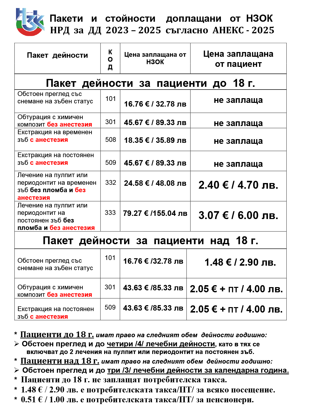 | Екстракция на зъб | 50 € / 97,79 лв |